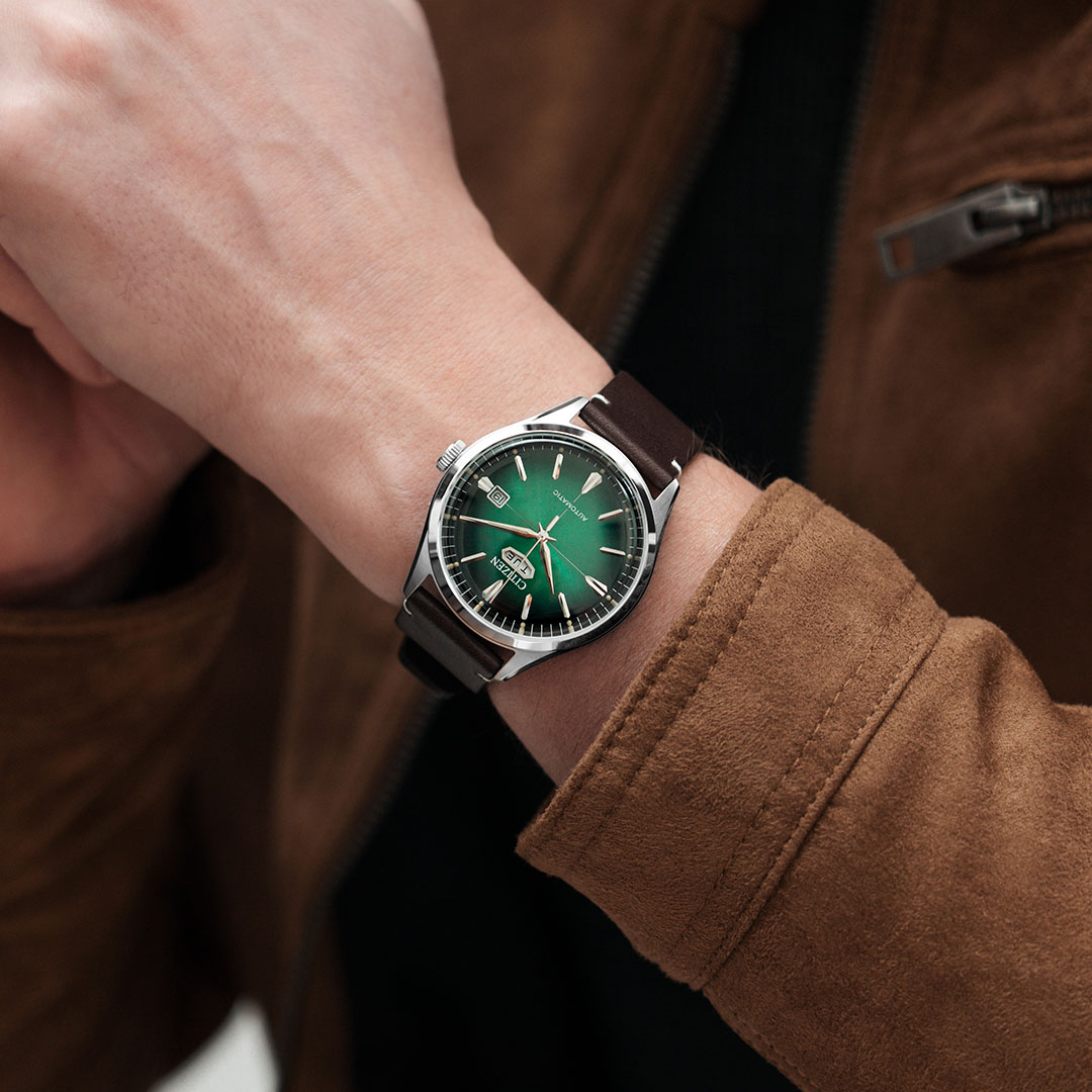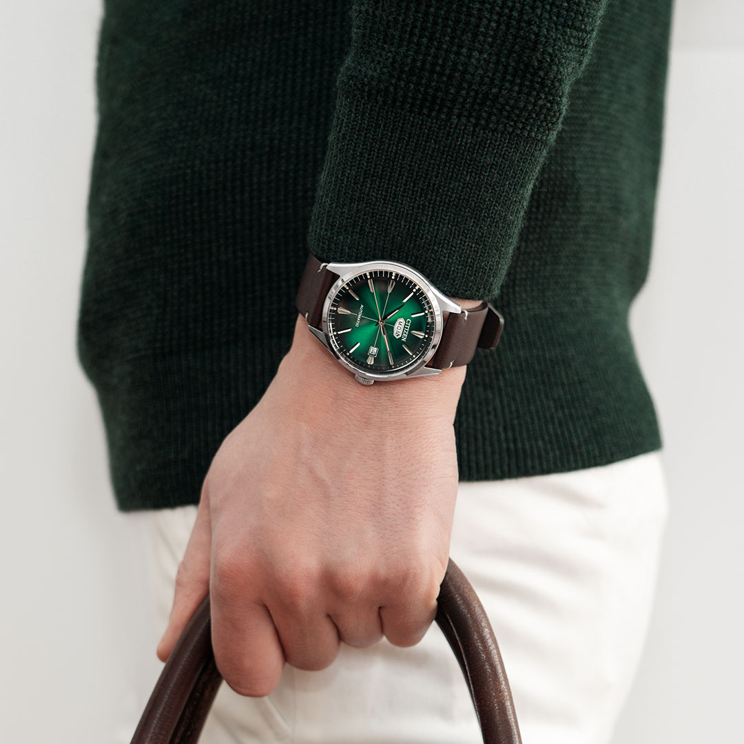 Grünes Zifferblatt und schwarzes Lederarmband