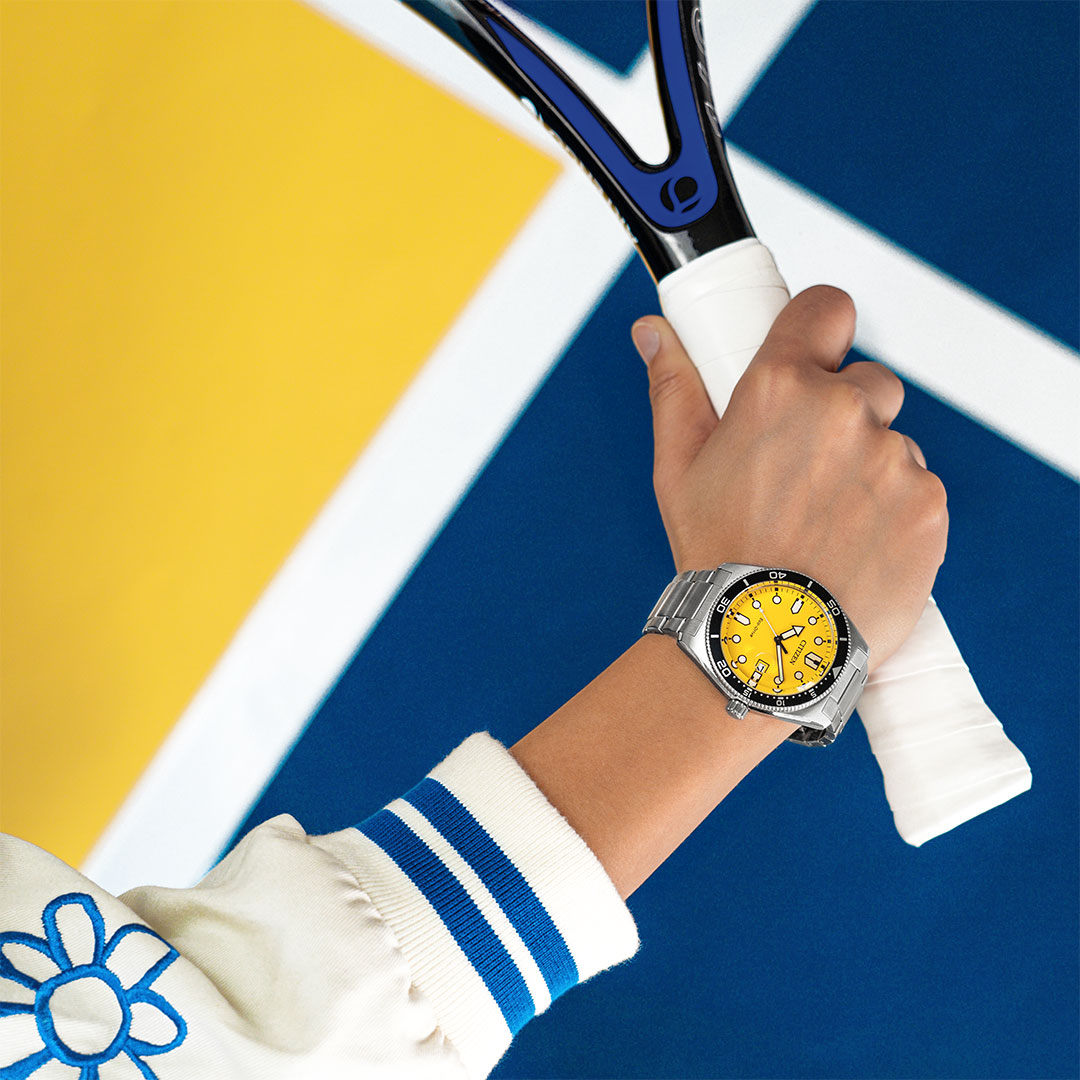 Gelbes Zifferblatt und Stahlarmband